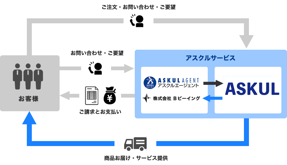 アスクルはエージェント(代理店)制度を採用しており、アスクルをご登録されているお客様には必ず担当のエージェントがついています。 Bビーイングは全国で活動している約1200社のアスクルエージェント(代理店)の1社です。 エージェントは、同じように見えても、大切にしているコトやモノが違います。 弊社は、アスクルを通して繋がったお客様とのご縁を大切にし、アスクルを快適に楽しくご利用いただけるように、定期的なご連絡や運用のサポートなどを独自で行っております。コンセプトは「顔が見える通販」です。通信販売でも、お客様とFace to Faceの関係を築き上げることを目標にし、ご利用上でのサポートや様々なサービスをご提供し、付加価値No1のアスクルエージェントを目指しております。